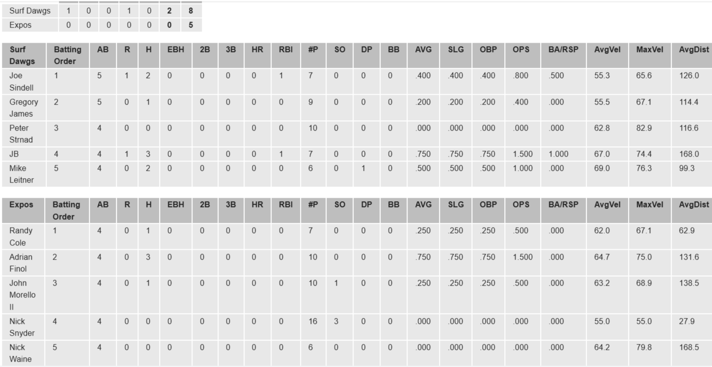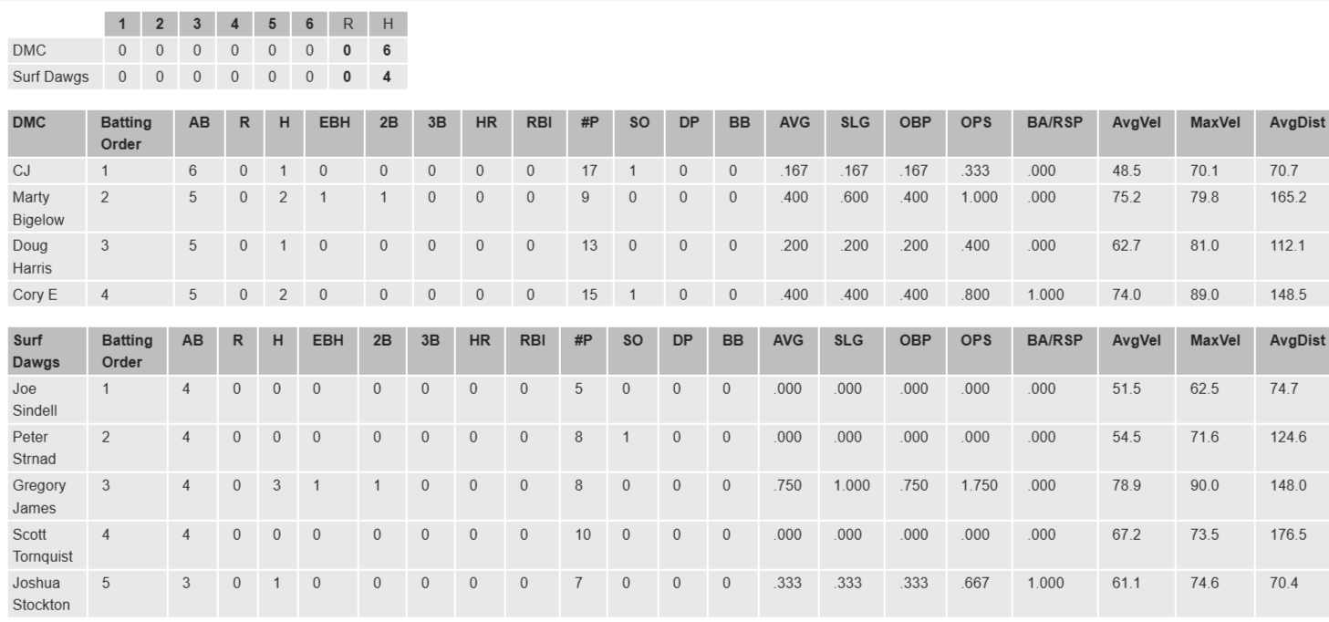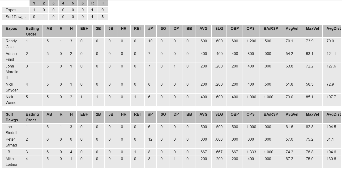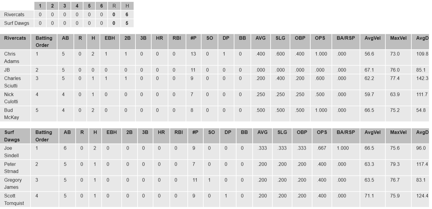 The Surf Dawgs consistently put the ball in play but couldn’t break through. Joe Sindell led the way offensively with a strong 3-for-5 performance, and Joshua Stockton added an extra-base hit of his own. Despite multiple base runners, the Surf Dawgs were unable to convert opportunities into runs, finishing the game scoreless.