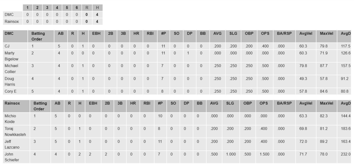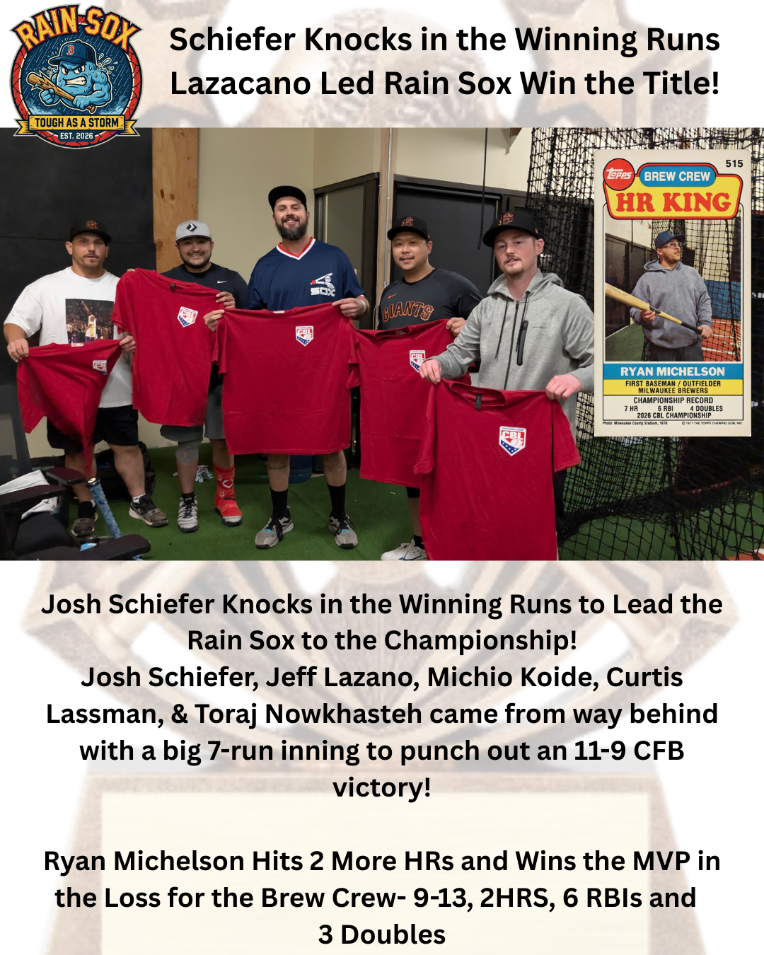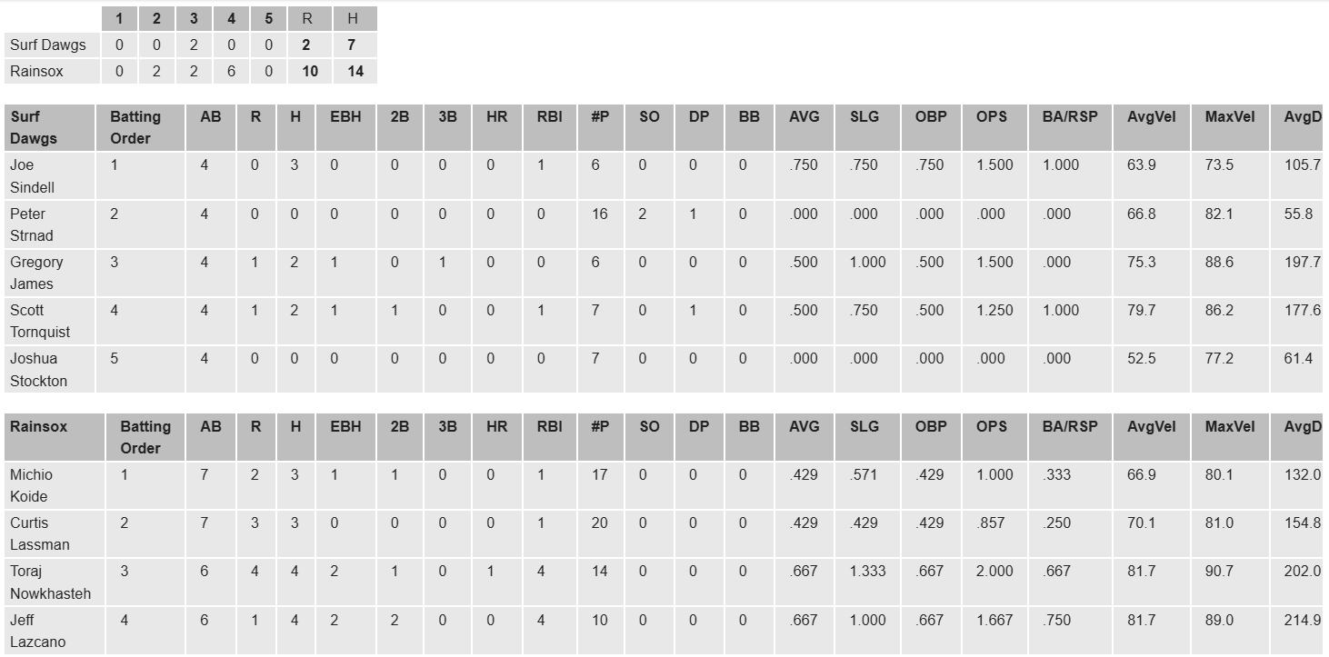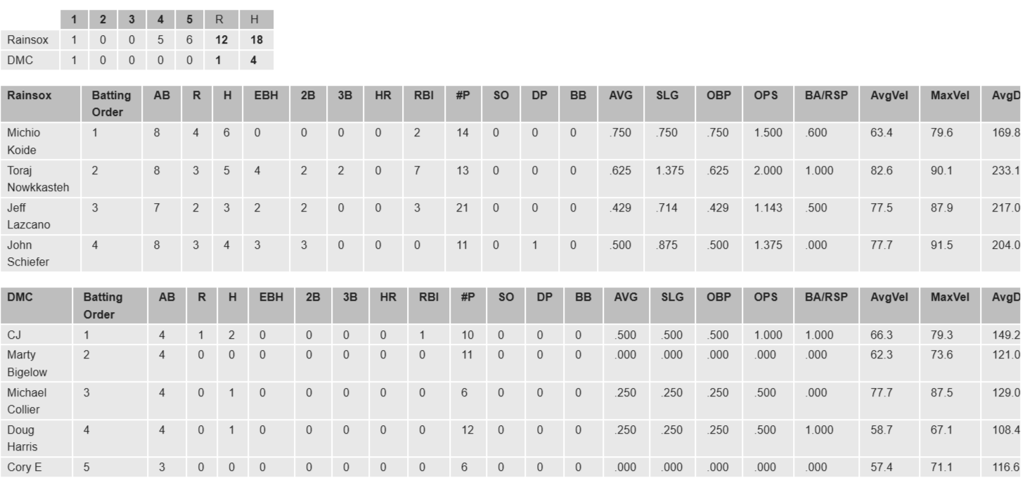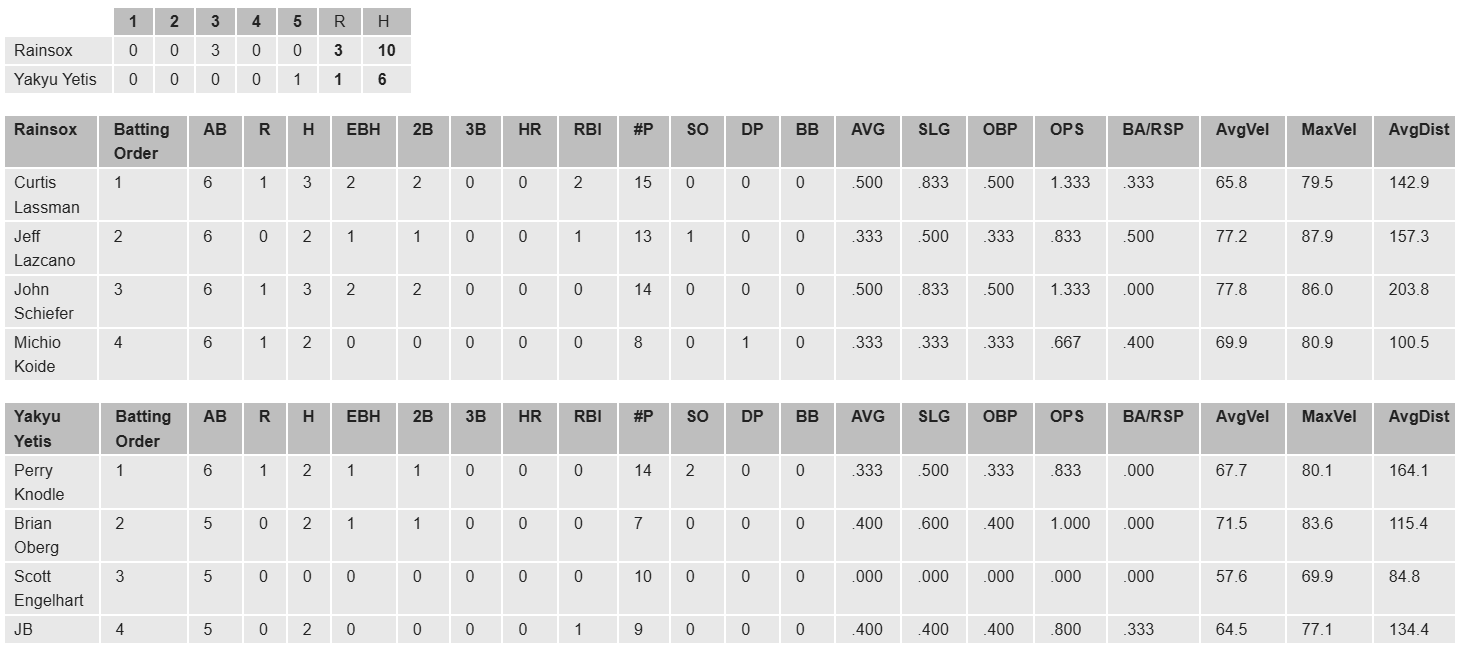 The Rainsox answered with steady production and clutch extra-base hits. Michio Koide and Jeff Lazcano each crossed the plate, while Curtis Lassman added the deciding run. Toraj Nowkkasteh supplied a key RBI with an extra-base hit, and John Schiefer proved pivotal in the middle of the order, driving in two runs on a double and a triple. The Rainsox lineup consistently applied pressure, making the most of their opportunities. BOX SCORE BELOW