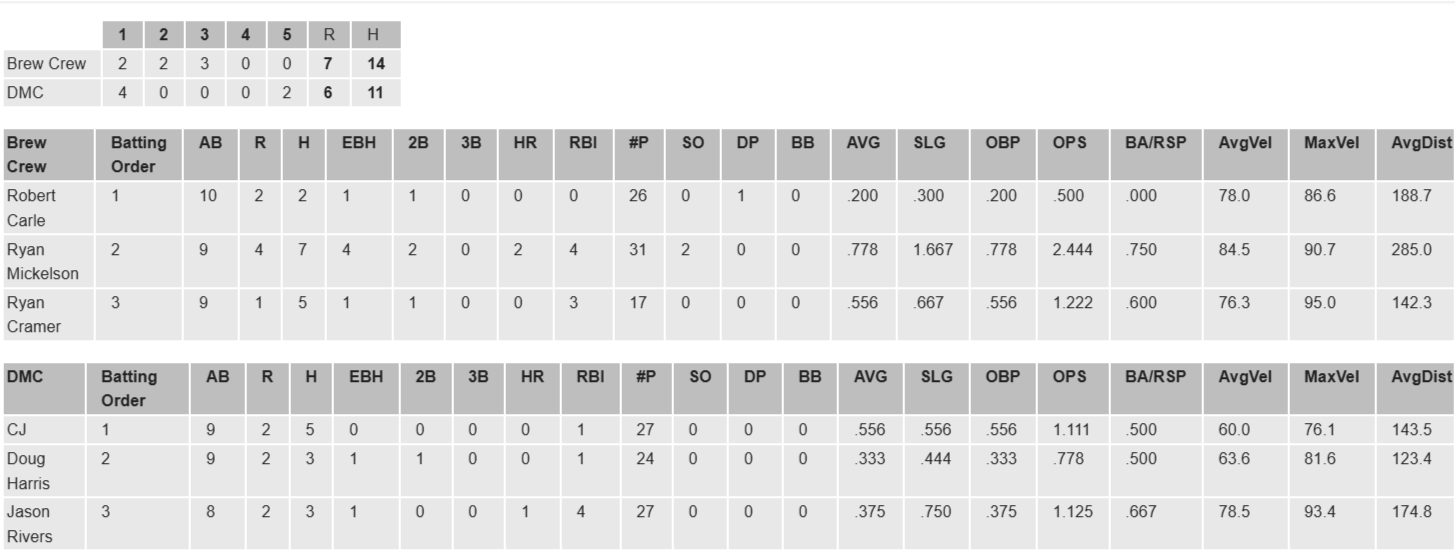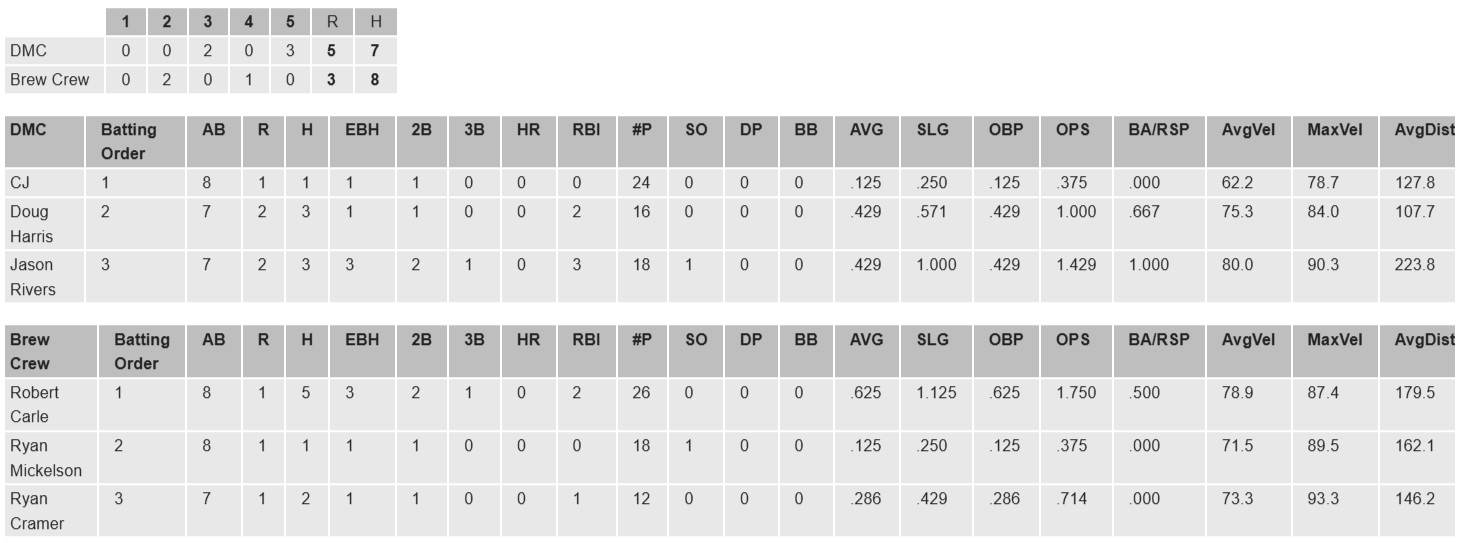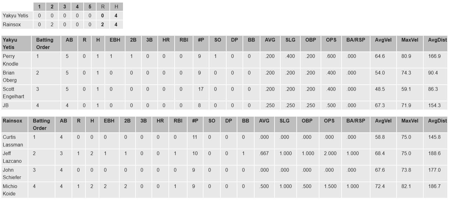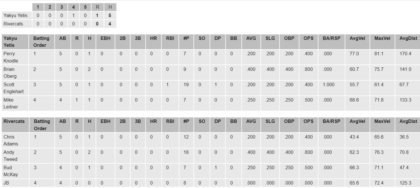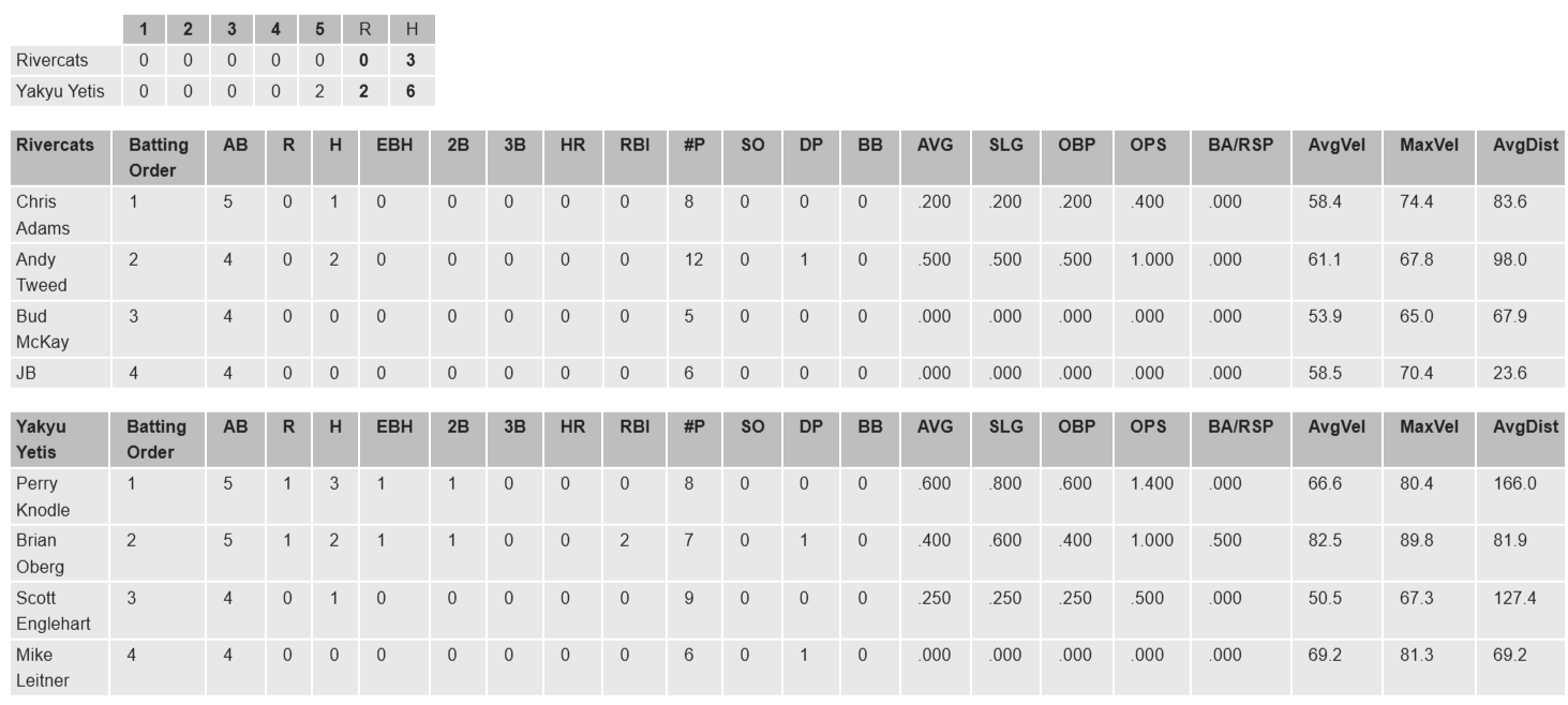 The Yetis answered with solid individual performances but struggled to string together rallies. Brian Oberg led the way offensively, going 3-for-6 with two doubles and scoring a run, while Perry Knodle added a double and crossed the plate once. JB contributed two hits and an RBI, accounting for the remaining Yetis run, but the lineup was otherwise held in check. Box Below