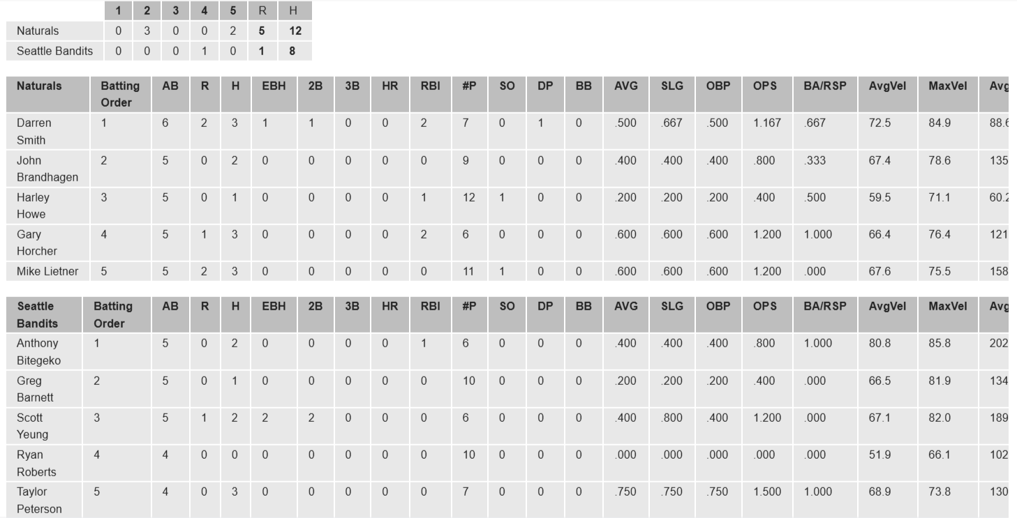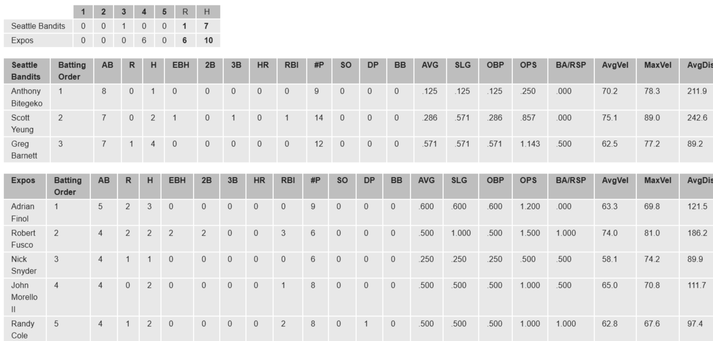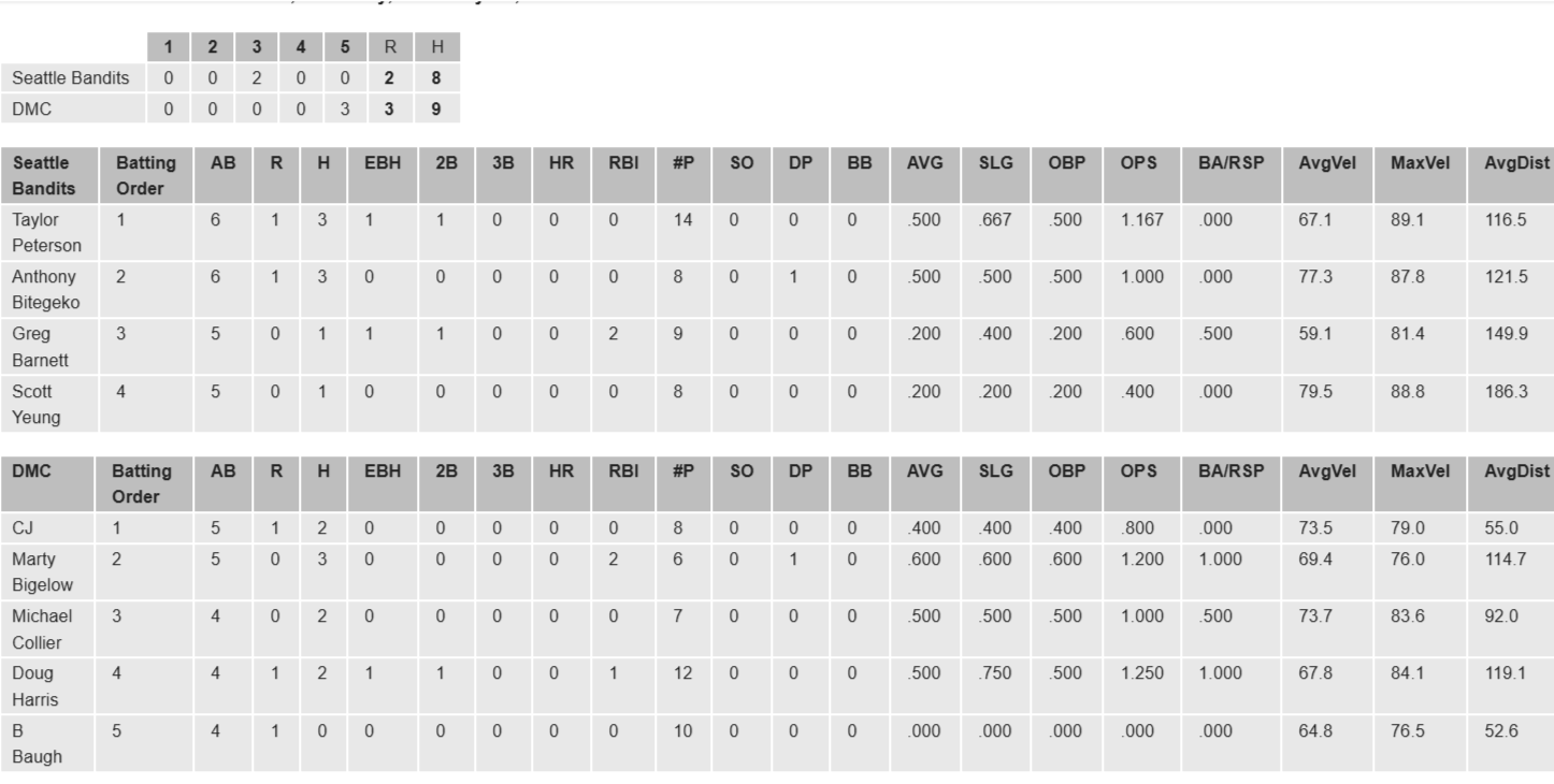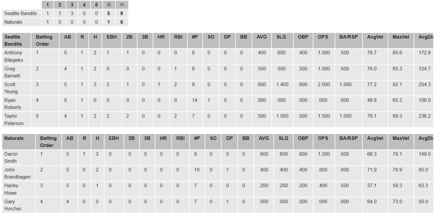 The Seattle Bandits delivered a strong all-around offensive performance to defeat the Yakyu Yetis 6–2, using consistent contact and timely production throughout the lineup.