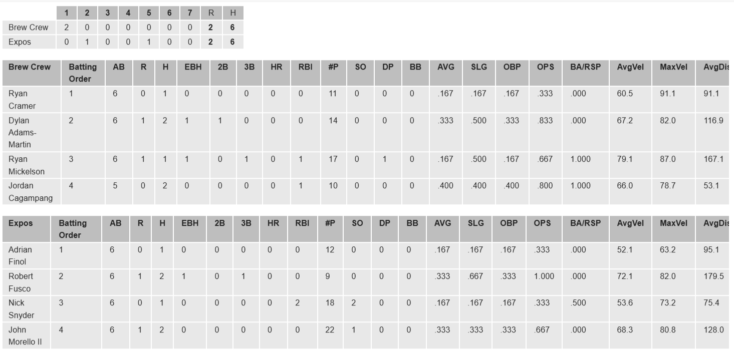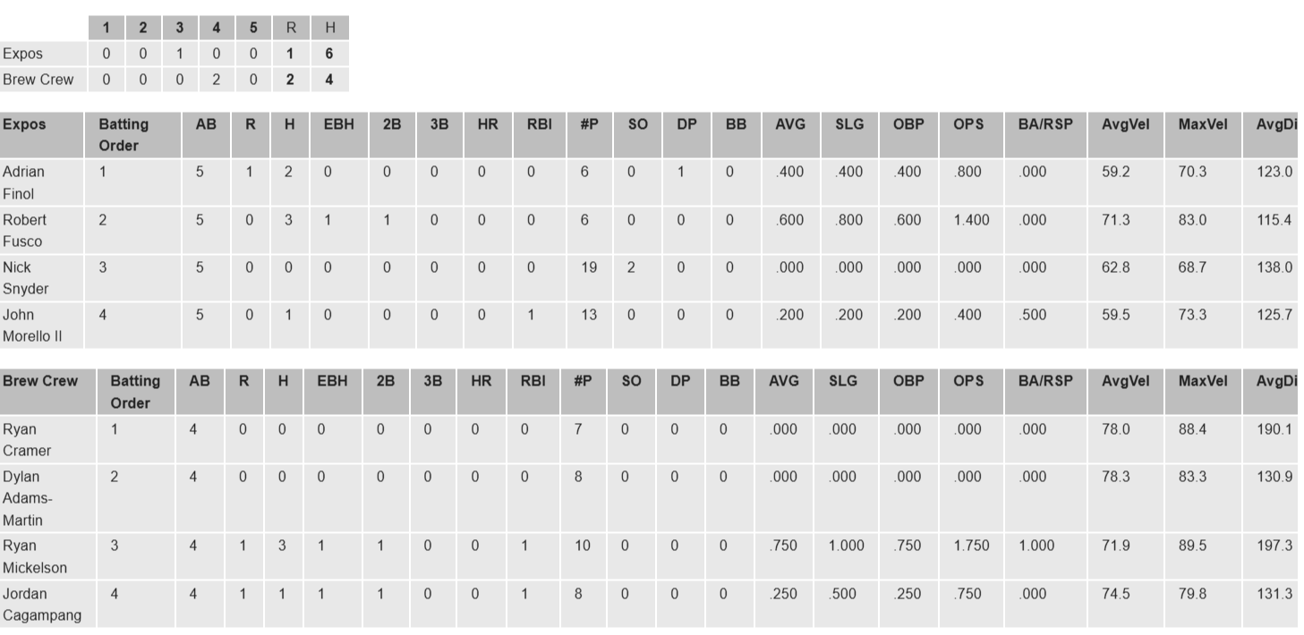 The Expos put together consistent contact throughout the game, collecting eight hits overall. Robert Fusco set the tone at the top of the order with a 2-for-5 performance, while Adrian Finol also went 2-for-4 and scored a run. The Expos’ scoring came through situational hitting, as John Morello II delivered an RBI double and Scott Palonaki added an RBI of his own to bring home the team’s two runs. Despite multiple chances, the Expos were unable to add on late.
