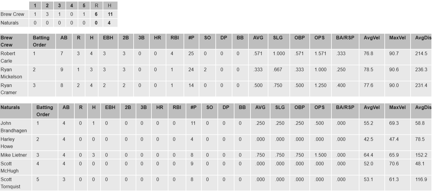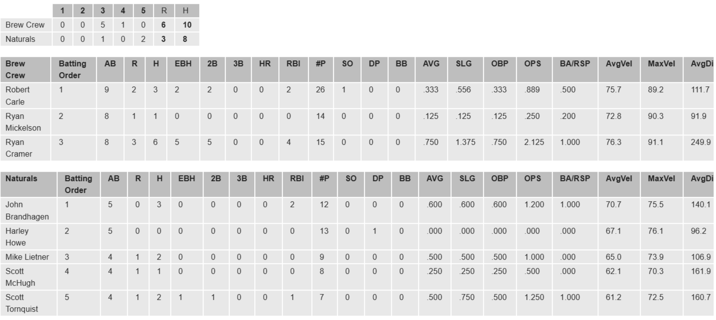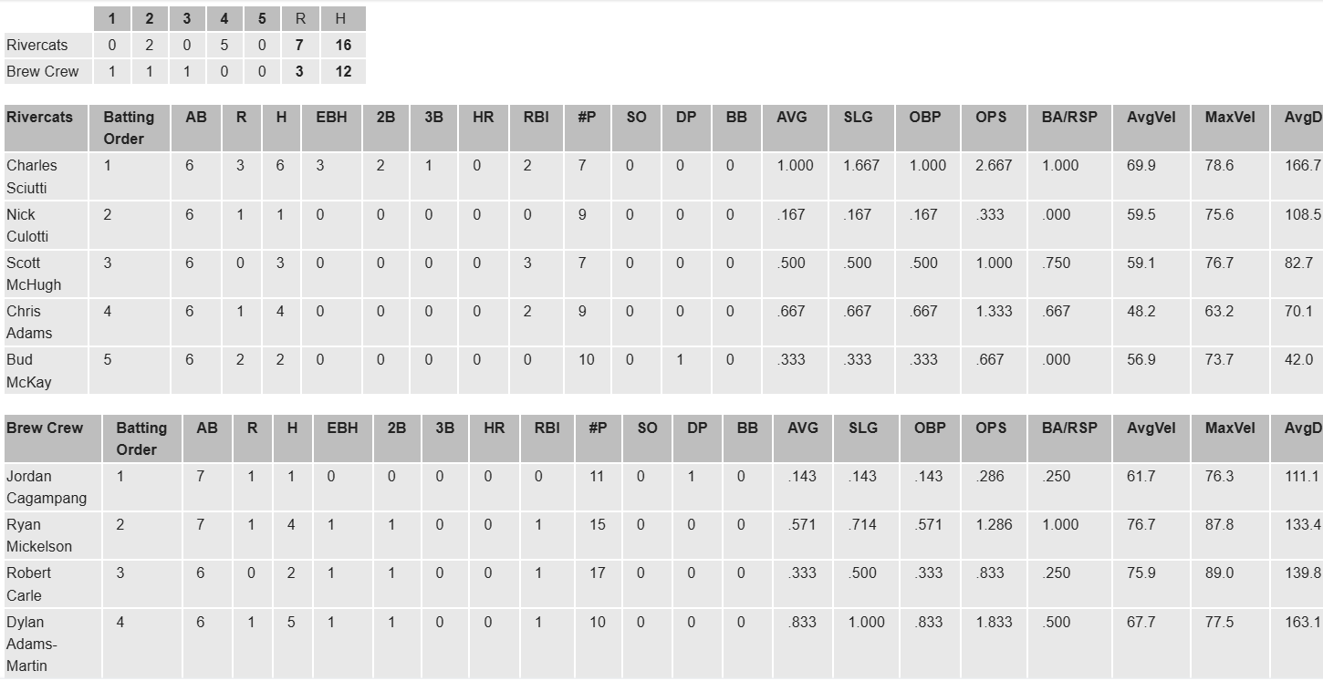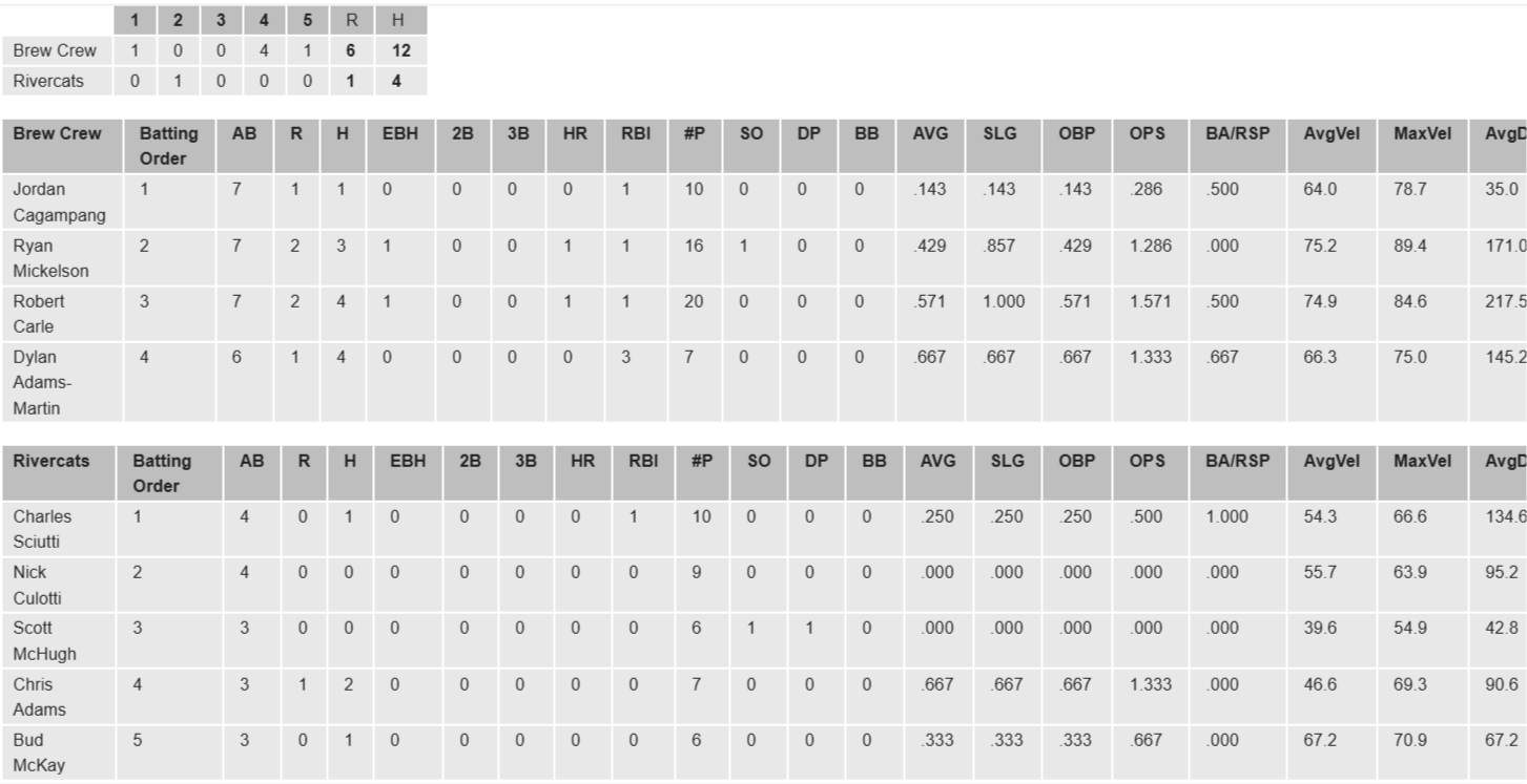 The Brew Crew answered with balanced production throughout the lineup. Jordan Cagampang went 2-for-4 and scored one of the team’s two runs, while Ryan Cramer added the other run and supplied extra-base pop with a double and a triple. Ryan Mickelson also chipped in with an RBI extra-base hit, and Robert Carle reached base twice and drove in a run to help push the Brew Crew ahead.