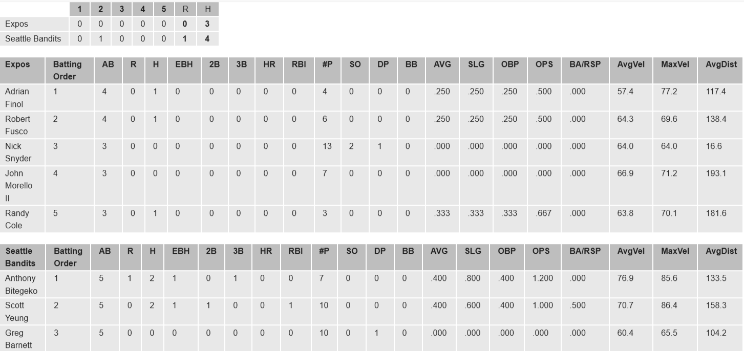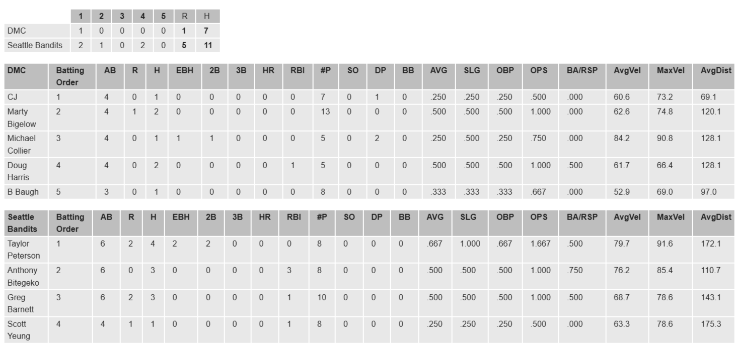 Seattle struck first behind Anthony Bitegeko and Christian Collins, who each scored a run. Bitegeko went 2-for-5 out of the three spot, while Collins delivered the most impactful bat of the day for the Bandits, going 2-for-5 with two doubles, accounting for both of Seattle’s extra-base hits. Greg Barnett added an RBI single, but the Bandits were otherwise kept in check, managing just five total hits.