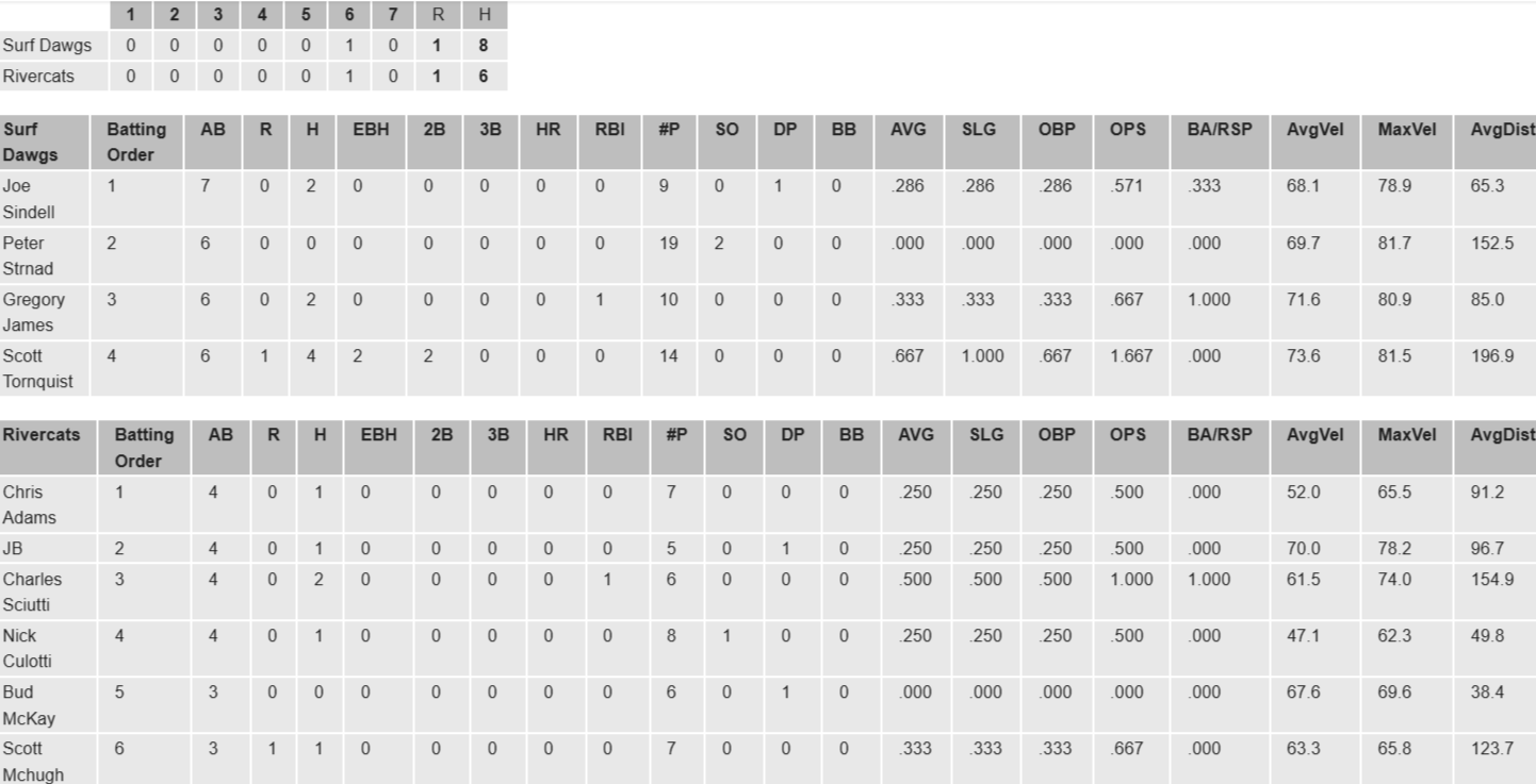 The Surf Dawgs scratched across their lone run behind Gregory James, who scored after reaching base, and Peter Strnad, who delivered the team’s key extra-base hit with a triple and drove in the only run. Strnad and James each finished with a hit, but the Surf Dawgs offense was otherwise quiet, managing just four hits on the day and struggling to build sustained rallies.